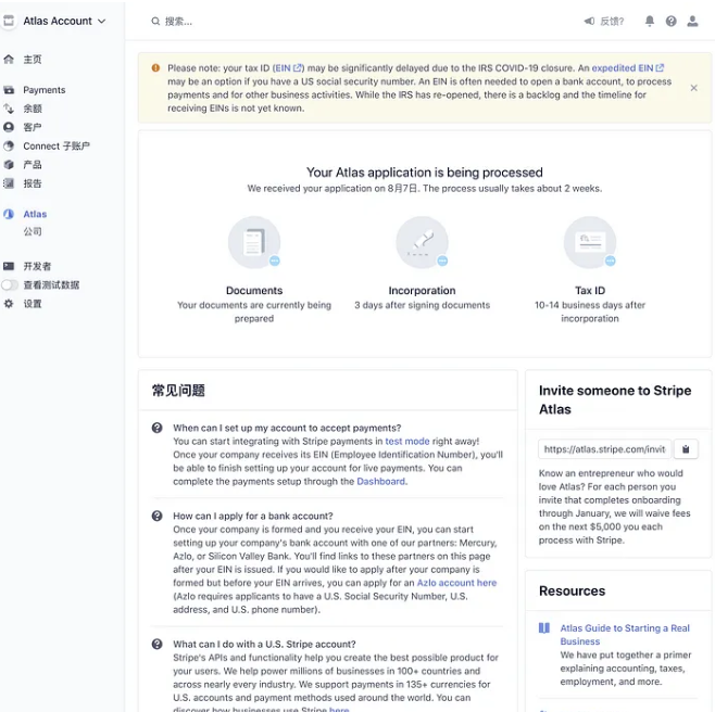 按照Stripe的说法,通常只需要两个星期就可以完成EIN的申请了。但是我运气比较长,赶上了新冠疫情导致的IRS暂停部分业务,实际上我是等了两个月才完成注册的。