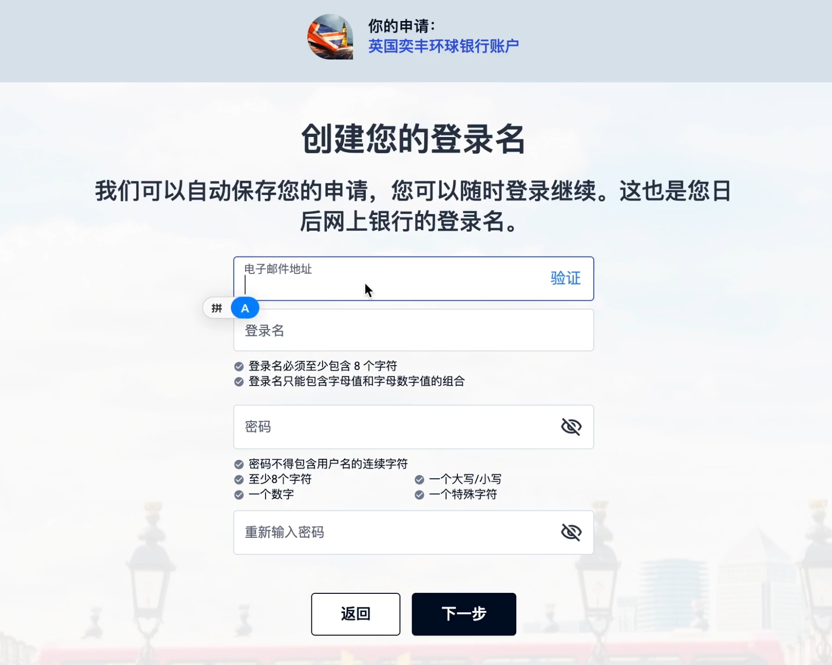 我们点击链接之后,先把语言改一下,改成简体中文,然后看一下相关的声明,点击同意并继续,然后点击开始,选择不我是奕丰的新用户,选择我不是,然后呢在这里创建你的用户名跟密码 注意的就是用户名呢是需要英语字母和数字的组合 密码呢里面还需要加上一个特殊的字符。
