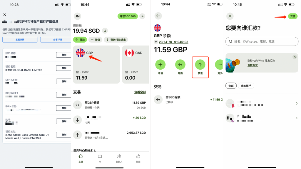 我们打开Wise,选择英镑账户,点击发送,点击充值,选择英镑,点击输入银行账户资料,收款人选择自己,输入账户资料,由于Wise是英国的银行可以直接使用FPS,输入排序代码+账户进行汇款。当然你也可以使用IBAN进行汇款,然后输入汇款金额,这个汇款时无损的,且实时到账。我们点击继续。