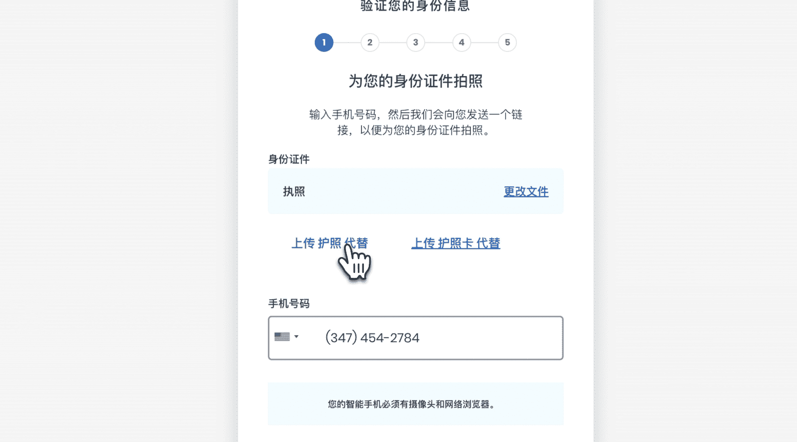 这里上传身份文件,默认的是执照,这个执照指的是美国驾照的意思。我们点击更改文件,选择上传护照代替。
