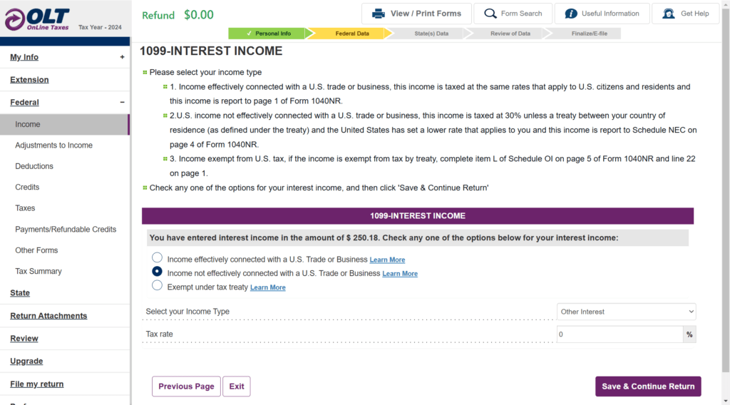 严格来讲,NRA的利息收入是不需要进行申报的,所以我们尝试另一条路线:1099-INT不填入任何信息,只是在后续的附件上传中,把1099-INT税表进行上传。