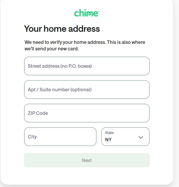 接下来,你需要填写更多的个人信息,包括你的地址和社会安全号码(SSN)。请注意,你必须是美国公民或合法永久居民才能注册Chime账号。