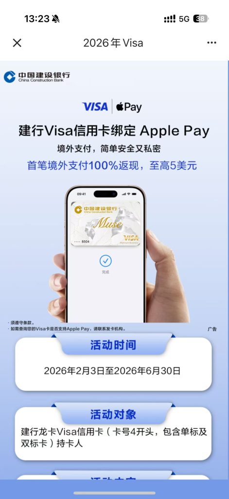 这个活动不是自动生效的,必须通过 Visa 指定的 App 或活动入口先绑定,直接在系统里加 Apple Pay 可能是拿不到返现的。